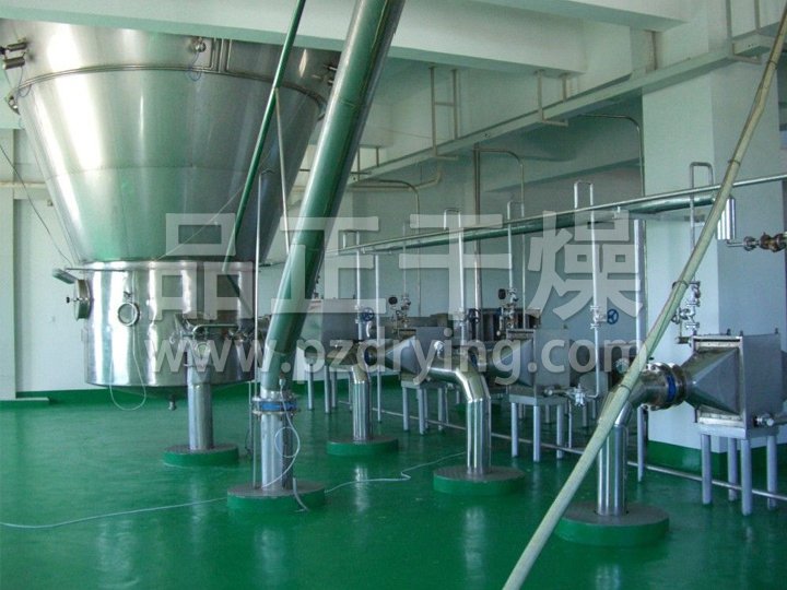 該生產(chǎn)線由供料系統(tǒng)、介質(zhì)循環(huán)系統(tǒng)、空氣加熱凈化系統(tǒng)、干燥塔系統(tǒng)、收料系統(tǒng)、控制系統(tǒng)等多個系統(tǒng)整合而成。主塔系統(tǒng)集中了目前噴霧干燥工程的所有尖端技術(shù),噴干機組的收料系統(tǒng)由一級旋風(fēng)分離器+布袋除塵器組合形成。一級旋風(fēng)采用高氣量高效率旋風(fēng)進行收集,其收粉率能達到96%左右分,而布袋除塵器是針對蛋白粉類除塵專門設(shè)計的優(yōu)化設(shè)備,能使物料與風(fēng)進行完全分離并沉降,布袋為拒水防油防靜電布袋,過濾目數(shù)可達500目以上。